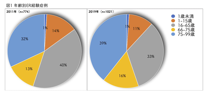 まず背景として8年前に松尾先生が初期研修をなさられていた当時に比べ、糸魚川地域では相当な高齢化が進んでおり令和2年4月現在、高齢化率は、37.1%にもなります。それに伴って当院の患者層も高齢化してきていますが、傷病者はほぼ全例が当院にいらっしゃる状況には変化がないため、乳児から超高齢者に至るまで幅広く診察ができる状況は維持されていることがわかります。(図1)