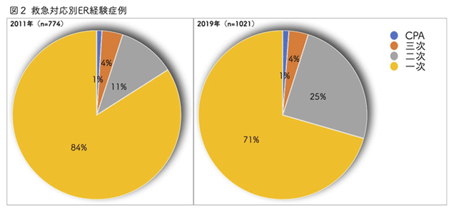 また、来院する受診患者の重症度においても、いわゆる風邪から多発外傷、急性心筋梗塞、CPAなどに至るまで幅広くカバーしており、入院加療が必要な二次救急の割合はむしろ増加していることから、以前にもまして退院までのシームレスなフォローをしやすい環境となっていることがわかります。(図2)