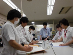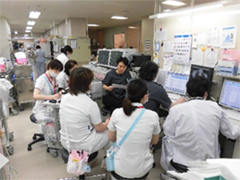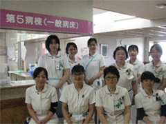 内科単科の病棟です。循環器・消化器など様々な患者さんが入院され、急性期から慢性期まで幅広く、医療・看護を展開しています。必要とされる看護も多様ですが、医師・看護師・リハビリ・MSWなど多くのスタッフと共に患者さんの健康回復に努めています。活気のあるスタッフが多く、明るく元気一杯の職場です。